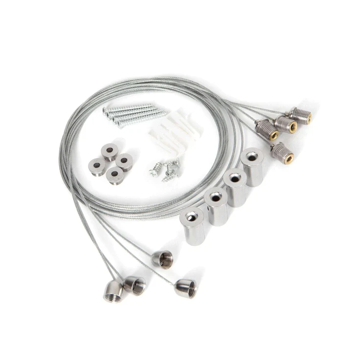 De 4 lange bussen worden gemonteerd tegen het plafond. Vervolgens kan de houder met de staalkabel worden ingeschroefd aan beide zijdes, waarna de kabel op lengte kan worden gesteld.
